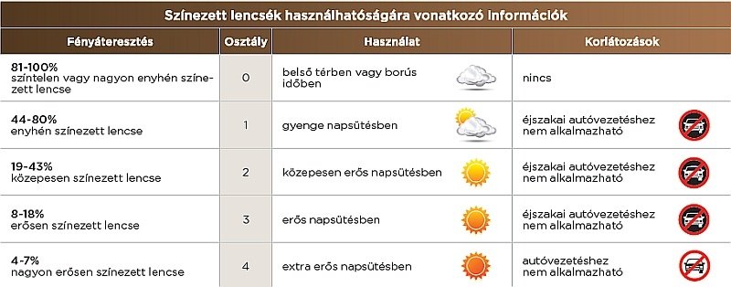 Fontos tudni azt, hogy ezek a kategóriák éjszakai vezetéshez nem alkalmazhatóak. A 4. osztályt pedig a nagyon erősen színezett lencsék teszik ki, amelyek extra erős napsütésben (pl. gleccsersízés) nyújtanak kényelmes látást, azonban ezek a szemüveglencsék már nappali vezetéshez sem alkalmasak, mert fényáteresztésük kevesebb, mint 5%!