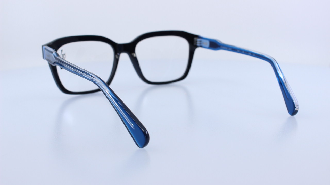 SÖTÉTKÉK FRONT ÉS VILÁGOSKÉK SZÁR RÉSSZEL KÉSZÜLT, FÉRFI SZEMÜVEGKERET, ACETÁT ALAPANYAGBÓL, KÜLÖNLEGES SZÖGLETES FORMÁVAL, A COCACOLA KOLLEKCIÓJÁBÓL.
