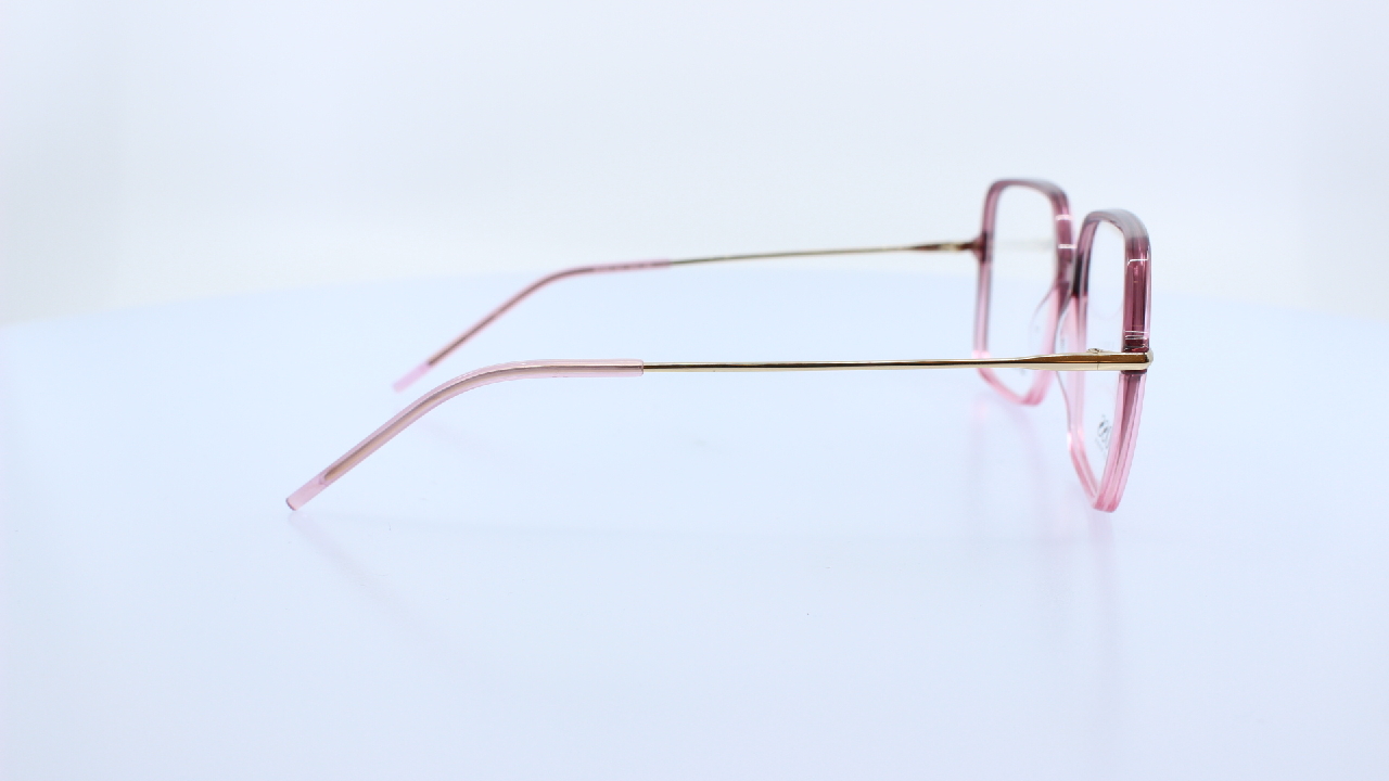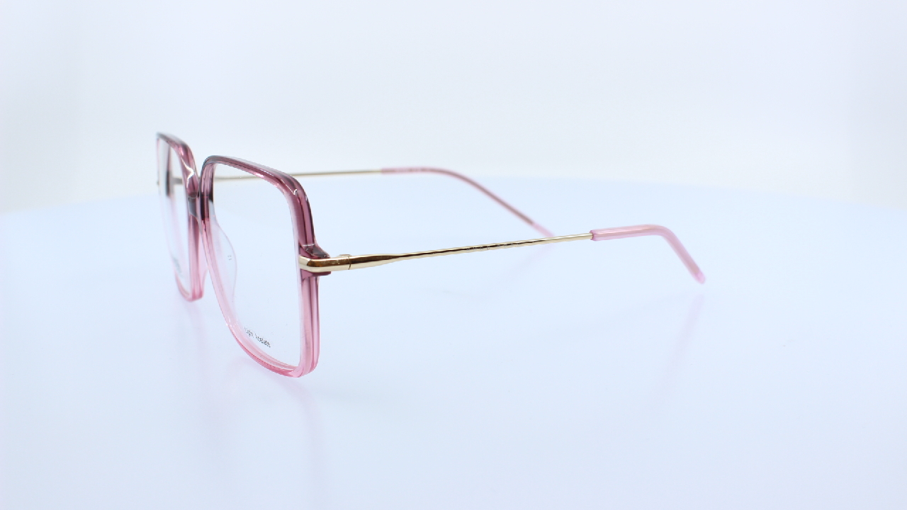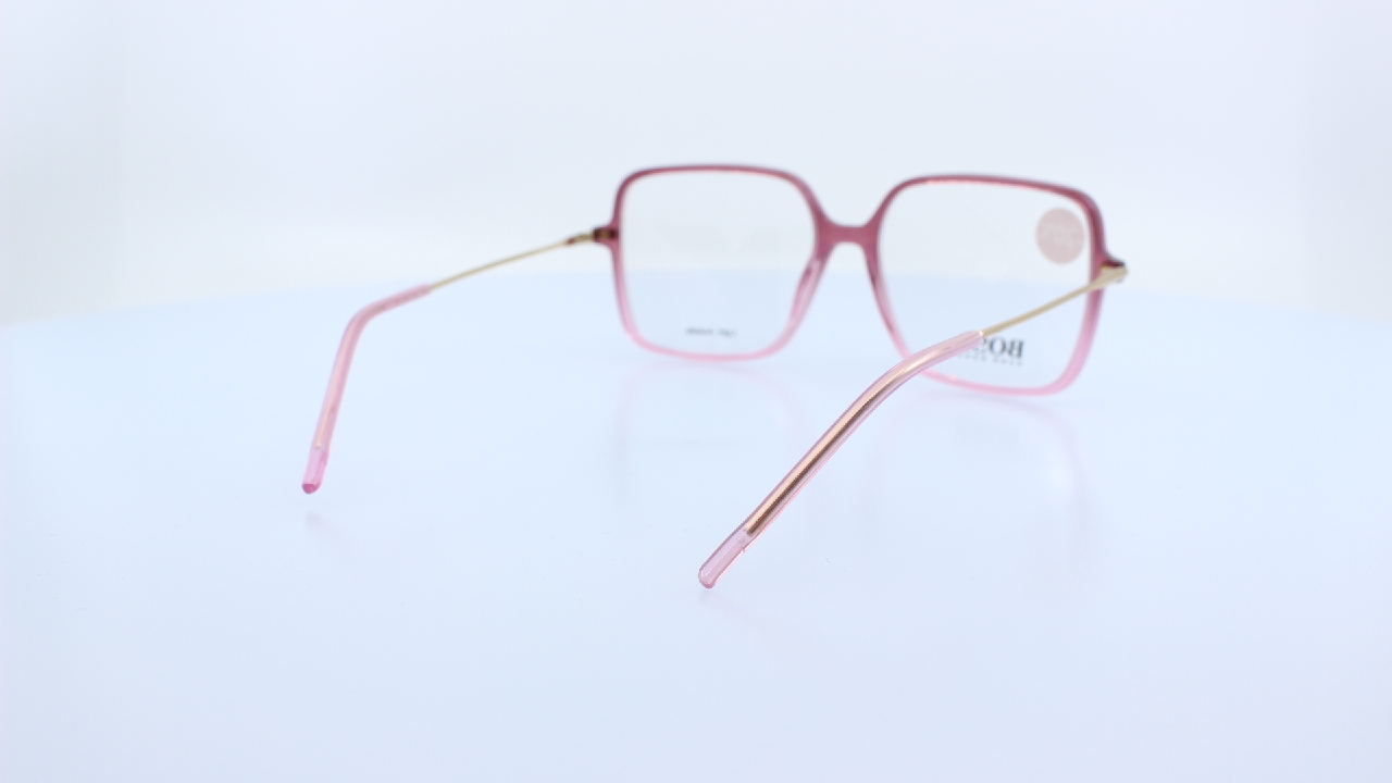 PINK FRONT ÉS ARANY SZÁR RÉSSZEL KÉSZÜLT MÜANYAG NŐI SZEMÜVEGKERET KÜLÖNLEGES SZÖGLETES LENCSEFORMÁVAL HUGO BOSS KOLLEKCIÓJÁBÓL.