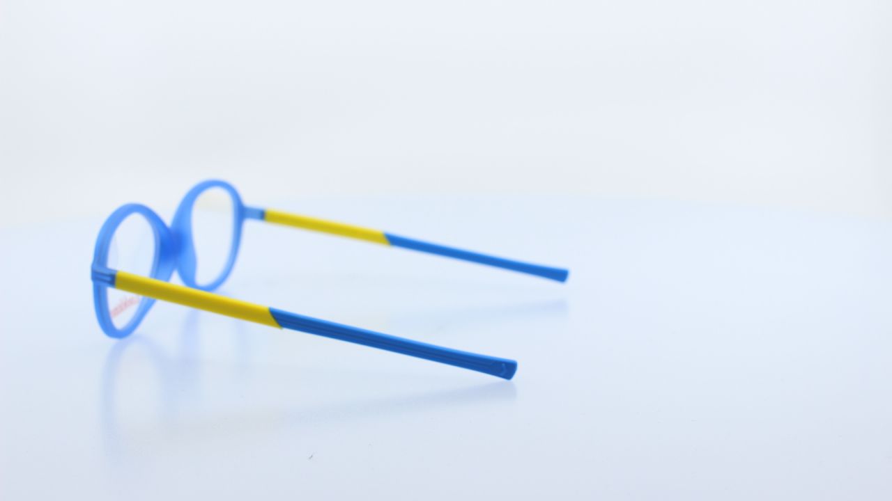 VILÁGOSKÉK FRONT ÉS SÁRHA SZÁR RÉSSZEL KÉSZÜLT, MŰANYAG GYERMEK SZEMÜVEGKERET, MAGAS MINŐSÉGŰ ALAPANYAGBÓL, KEREK LENCSE FORMÁVAL, LOOK KINO KOLLEKCIÓJÁBÓL.