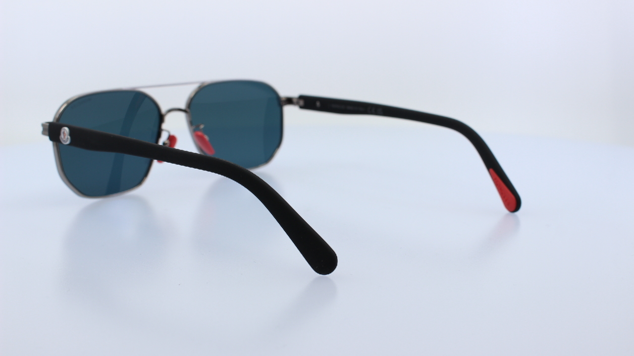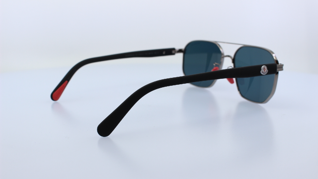 EZÜST SZÍNŰ FRONT ÉS FEKETE SZÁR RÉSSZEL KÉSZÜLT, FÉM UNISEX NAPSZEMÜVEG, KÉK SZÖGLETES PILÓTA FORMÁJÚ LENCSÉVEL, A MONCLER KOLLEKCIÓJÁBÓL.
