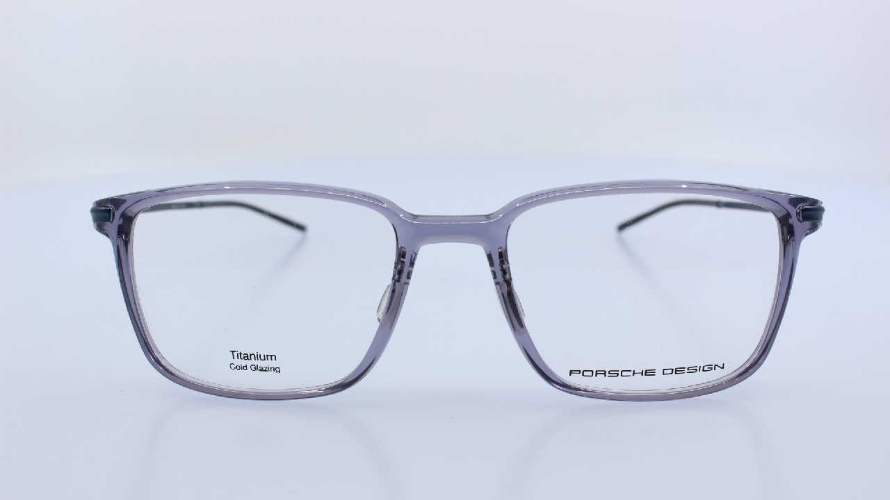 ÁTLÁTSZÓ SZÜRKE SZÍNŰ MŰANYAG FRONT ÉS SZÜRKE TITÁNIUM SZÁRRAL KÉSZÜLT, FÉRFI SZEMÜVEGKERET, SZÖGLETES FORMÁVAL, A PORSCHE DESIGN KOLLEKCIÓJÁBÓL