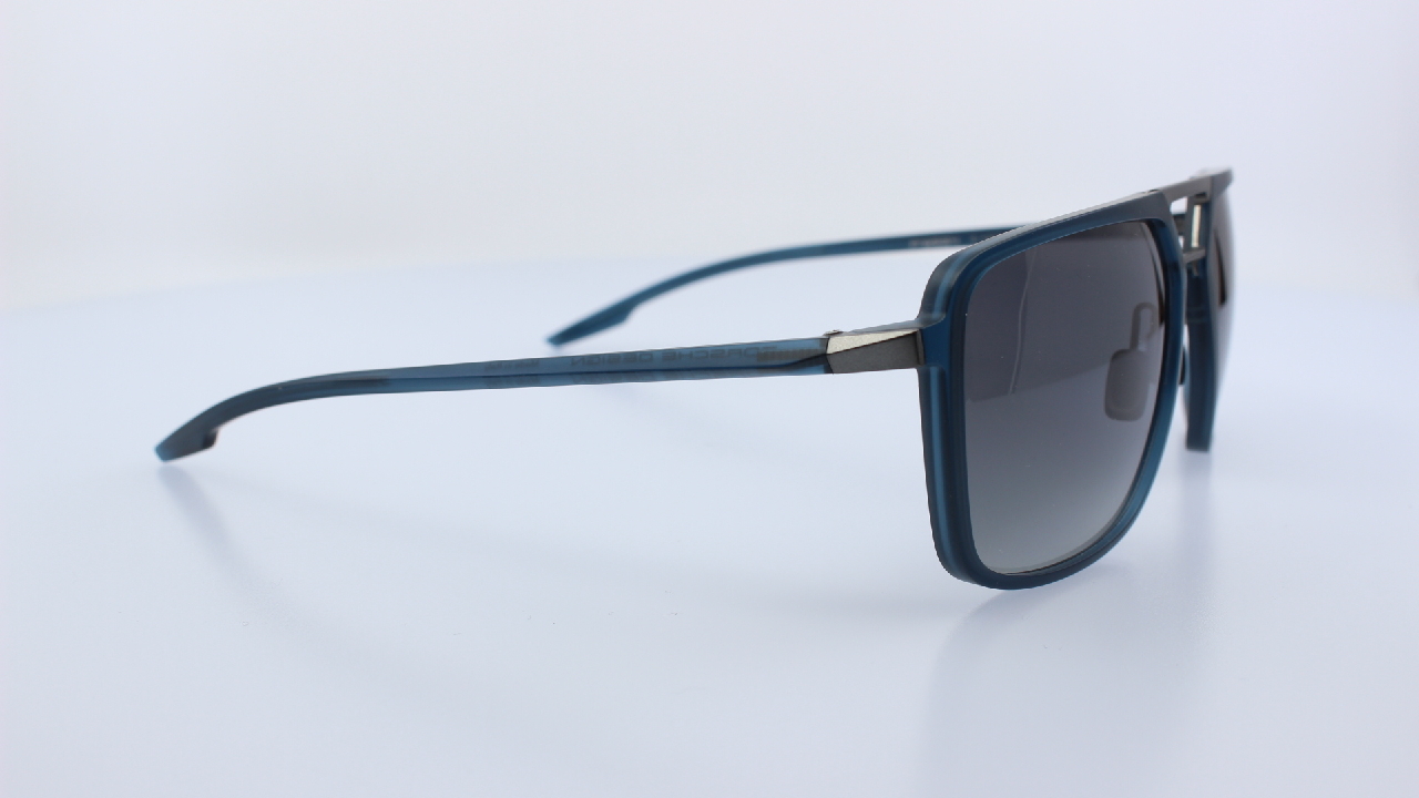 KÉK FRONT ÉS SZÁR RÉSSZEL KÉSZÜLT, FÉRFI NAPSZEMÜVEG, MAGAS MINŐSÉGŰ MŰANYAG ALAPANYAGBÓL, SZÜRKE LENCSÉVEL, KÜLÖNLEGES SZÖGLETES FORMÁVAL, A PORSCHE DESIGN KOLLEKCIÓJÁBÓL.